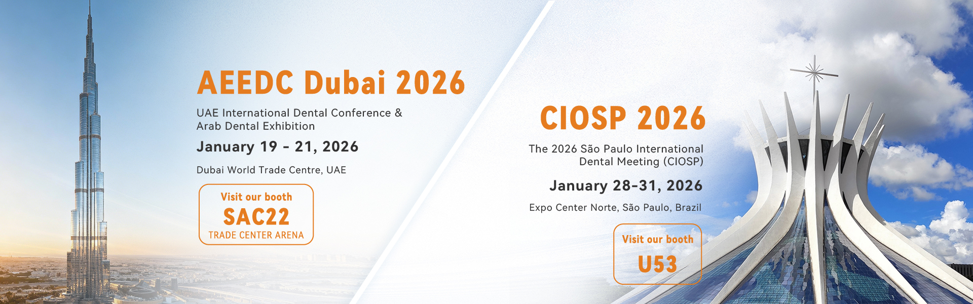 অডেন্টাল ঘোষণা করতে পেরে আনন্দিত যে তারা ২০২৬ সালের জানুয়ারিতে দুটি শীর্ষস্থানীয় আন্তর্জাতিক ডেন্টাল প্রদর্শনীতে অংশ নেবে—AEEDC দুবাই এবং CIOSP সাও পাওলো।